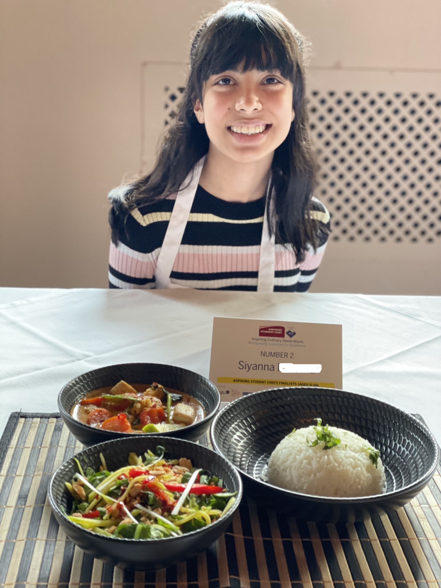 For her entry, Siyana prepared and cooked a red Thai curry with jasmine rice accompanied by a crunchy Thai mango salad in 90 minutes.